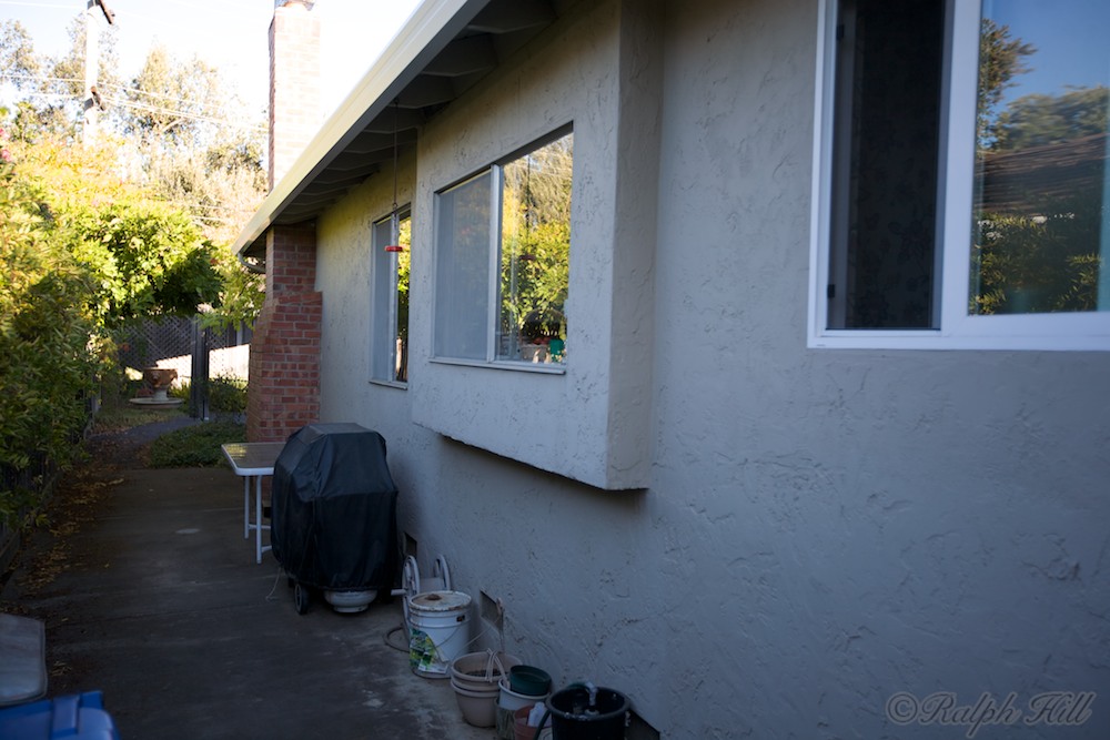 Outside the kitchen. This is the north wall of the house. The nearest window is the half bath by the laundry, then the main kitchen window. We want the new, larger window to project like this. The new window will be a bit to the left of where it is now.