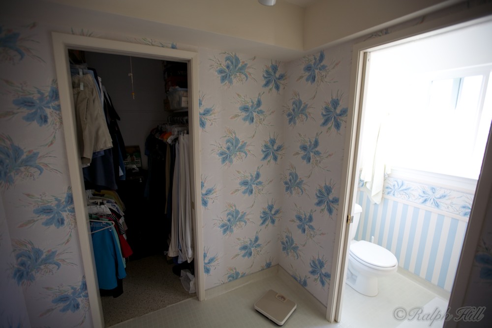 Here you can see the closet. There is another identical closet accessisble from the master bedroom. Currently there is a 28" pocket door separating the toilet and shower from the rest of the room. It is pretty much always open to let light in. The door to the closet is a 30" pocket door.
