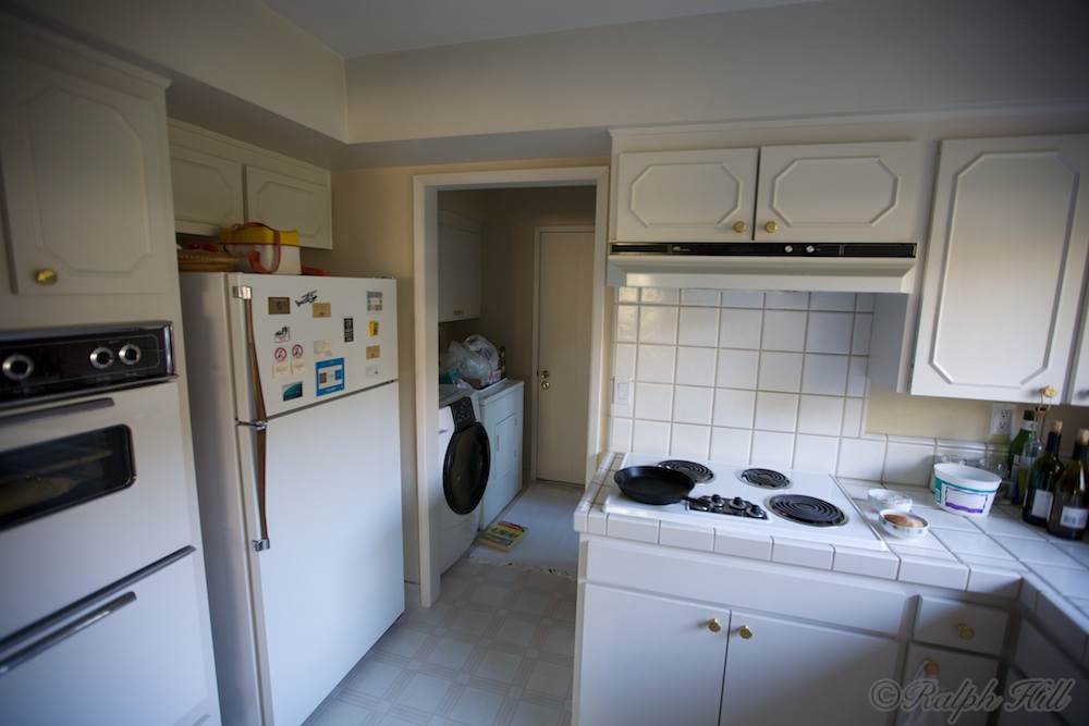 Standing in the kitchen you can see the lack of a landing area to the left of the cooktop and no landing area for the fridge. You can see into the laundry area. Notice the lack of a door between the laundry area and the kitchen. I think the only solution is a pocket door beside the fridge.